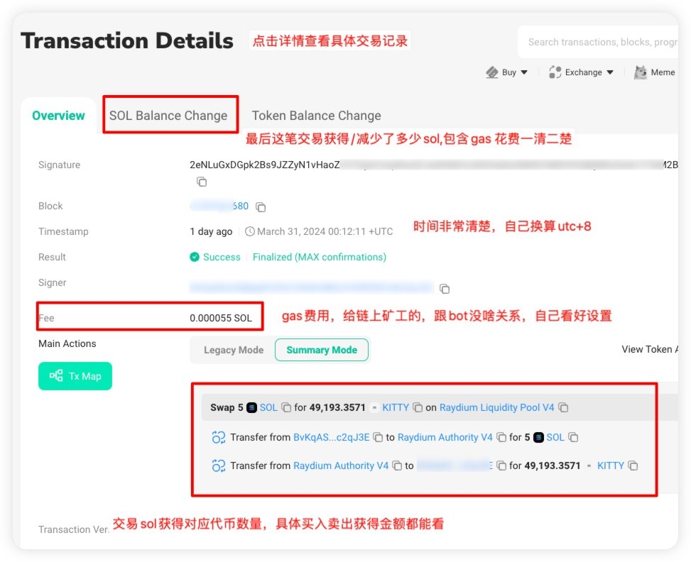 Click on SOL Balance Change to see the completion of this transaction and the total change in SOL balance, including transaction amounts and gas.