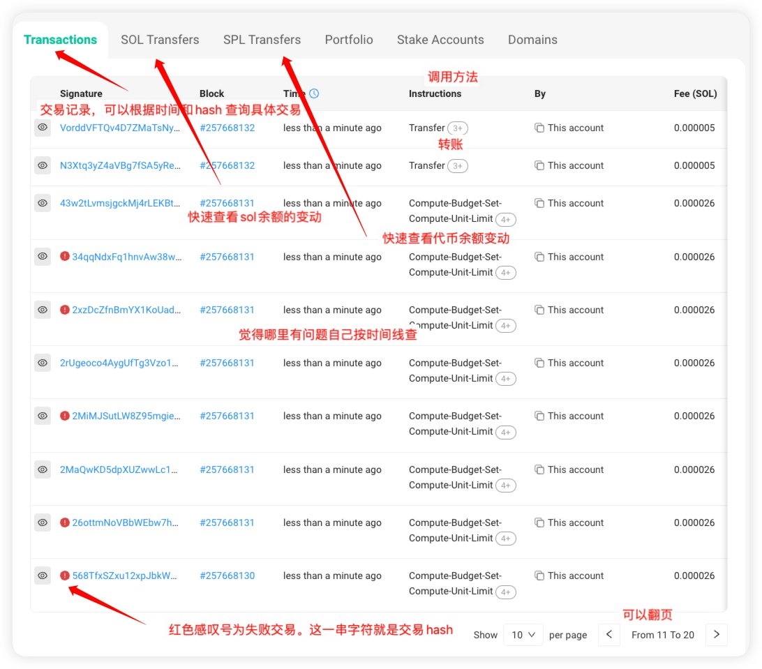 Transactions: You can view a list of transactions, including the time and details of each transaction. The first column, Signature, represents the hash.