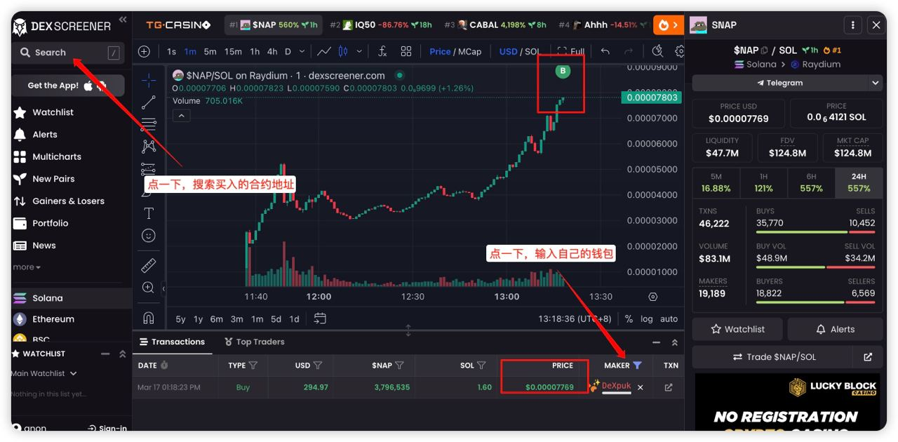 In the case of multiple transactions, check if you have successfully purchased in the DEX, how many purchases were made, and at what prices. This will give you an estimate of the actual profit, as the doubling data may be inaccurate due to timeouts. To begin, open https://dexscreener.com, search for the contract address, open the candlestick chart, and input your wallet address in the indicated location. This will show you the number and amount of successful transactions. Other failures only result in gas consumption without deducting the transaction amount.